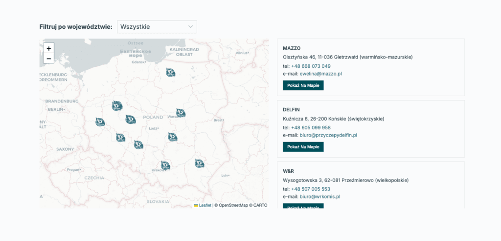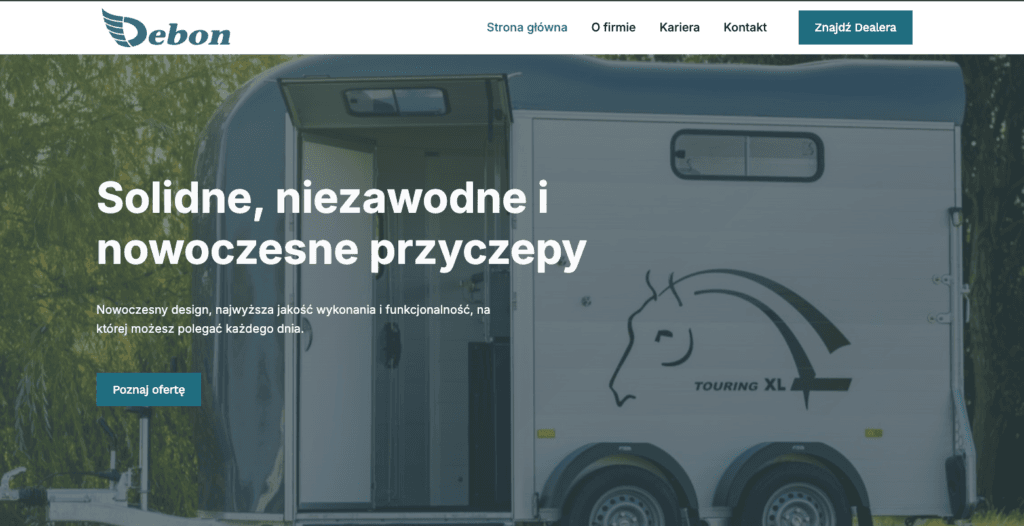 Strona wizytówka dla producenta przyczep wraz z interaktywną mapą dealerów umożliwiającą samodzielne zarządzanie punktami sprzedaży.